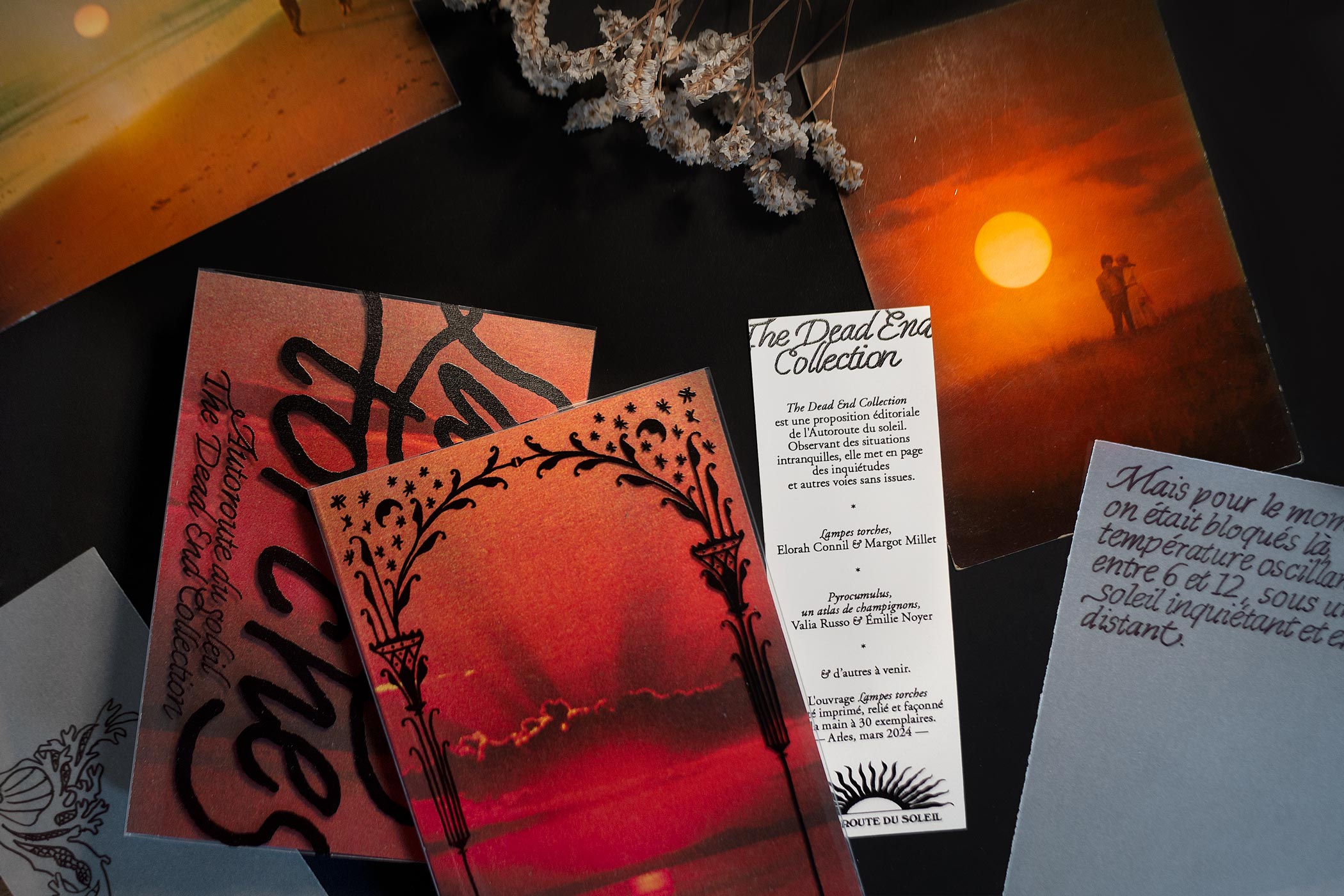Lampes torches est une balade poétique sur couchers de soleil, dans laquelle un texte d'Elorah Connil vient dialoguer avec une série de carte postales italiennes, glanées sur le marché aux puces via Maccherronai, à Palerme...